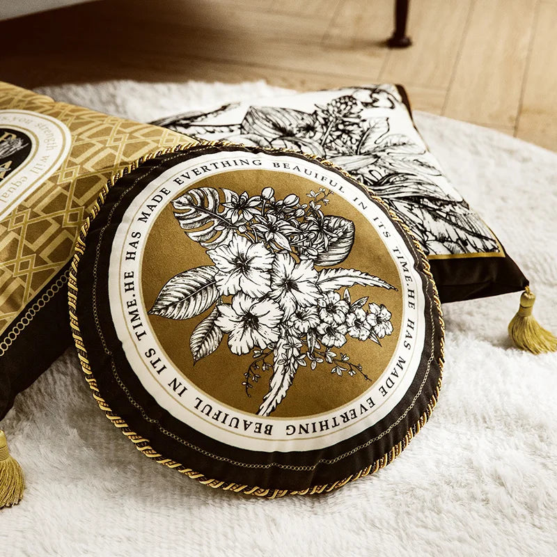 Majesté Florale – Motifs dorés géométriques et tulipes brodées, un esprit décoratif classique réinterprété.